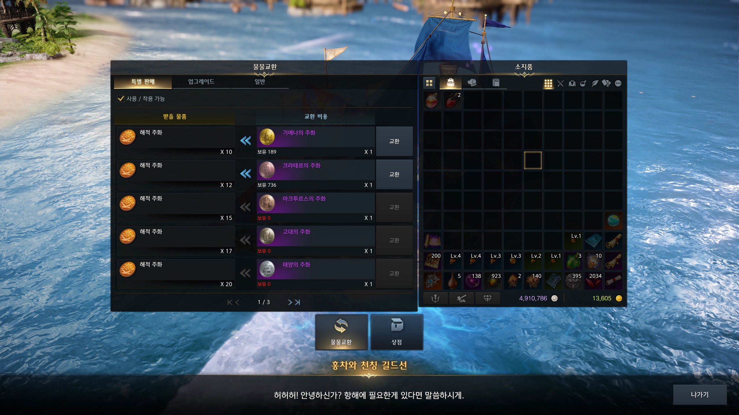 다만 일반적인 주화가 필요한 상황(섬의 마음 구입 또는 사용하시는 배 업글에 필요한 재료 구입 등)이 필요할 수 있으니 주화가 필요한 내용이 있는지 잘 확인해보시고 남는 주화로 해적주화를 교환해 사용하시길 바랍니다.