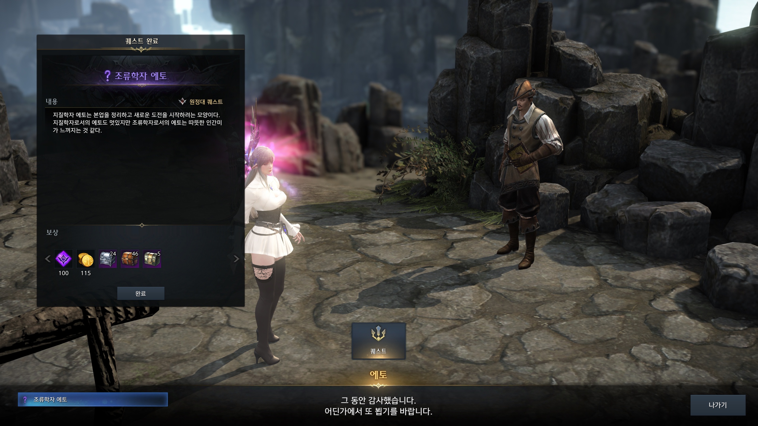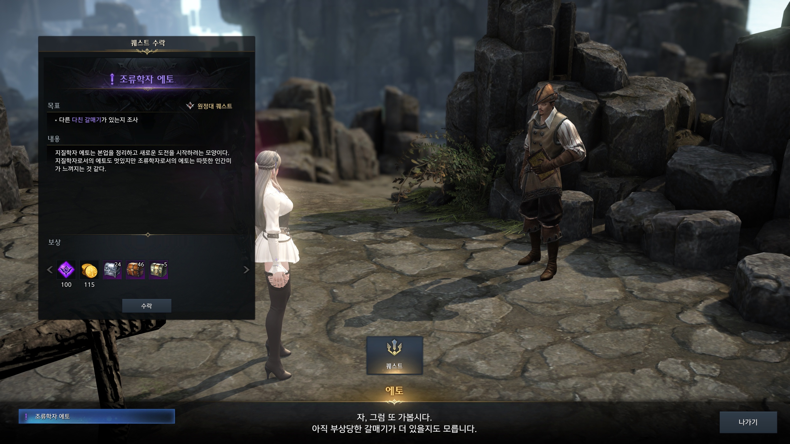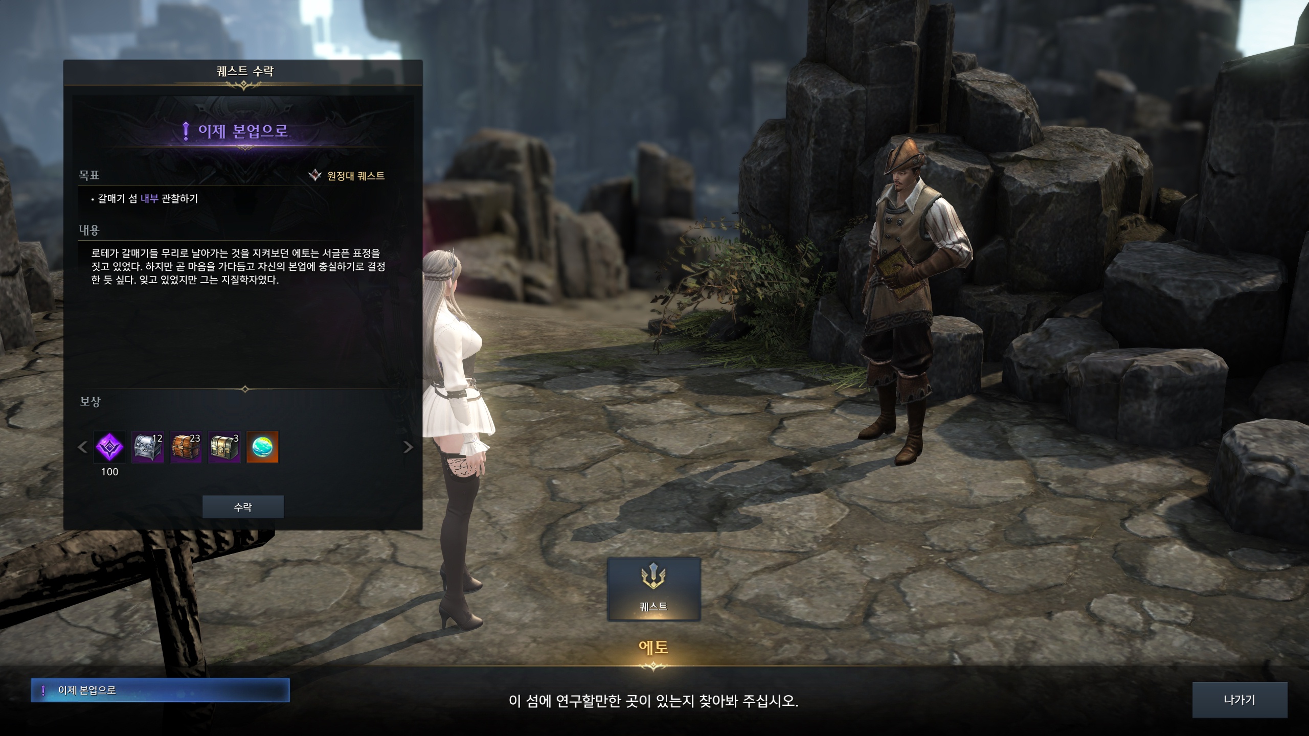 갈매기섬의 퀘스트의 경우 지질학자 친구가 갈매기를 구해주고 치료해주다보니.... 결국 ㅠ 조류학자가 되는 내용의 퀘스트인데, 갈매기를 구하고->치료해주고->다시 돌려보내주고 하는 퀘스트가 4번정도 반복됩니다.