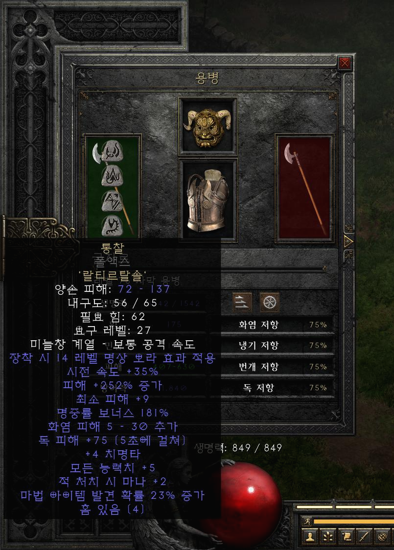 거의 모든 클래스가 성장구간에서 사용하는 갑옷 룬워드입니다. 소켓2개가 뚫려있는 갑옷이라면 뭐..ㅋㅋ 다됩니다. 액트2에서 다른지역 웨이 -> 다시 마을 반복을 하며 2소켓 갑옷만 구하면 바로 만들수있어 남녀노소 모든캐릭누구나 다 쓰는 갑옷 룬워드죠.